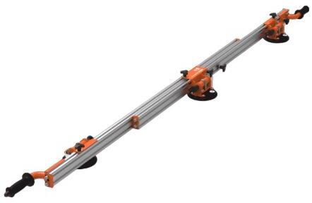 BATTIPAV AGILE LIGHT teleszkópos kézi lapszállító nagyméretű burkolólaphoz Alumínium szállítórúd (AGILE SYSTEM emelőrendszer része) nagyméretű táblák, burkolatok, kerlit, laminált üveg mozgatására, felhelyezésére. Maximum kihúzható szélesség: 172 - 330 cm A fogantyús végű alumínium profil hosszúsága teleszkóposan állítható az ideális mérethez (hosszabbítás, szélesítés). A 3 db erős gumiból készült, pumpálható, vákuumos tapadókorong durva felületeken is teljesen biztonságosan megtapad. Szett tartalma: 1 db teleszkópos alumínium rúd fogantyúval 3 db tapadókorong